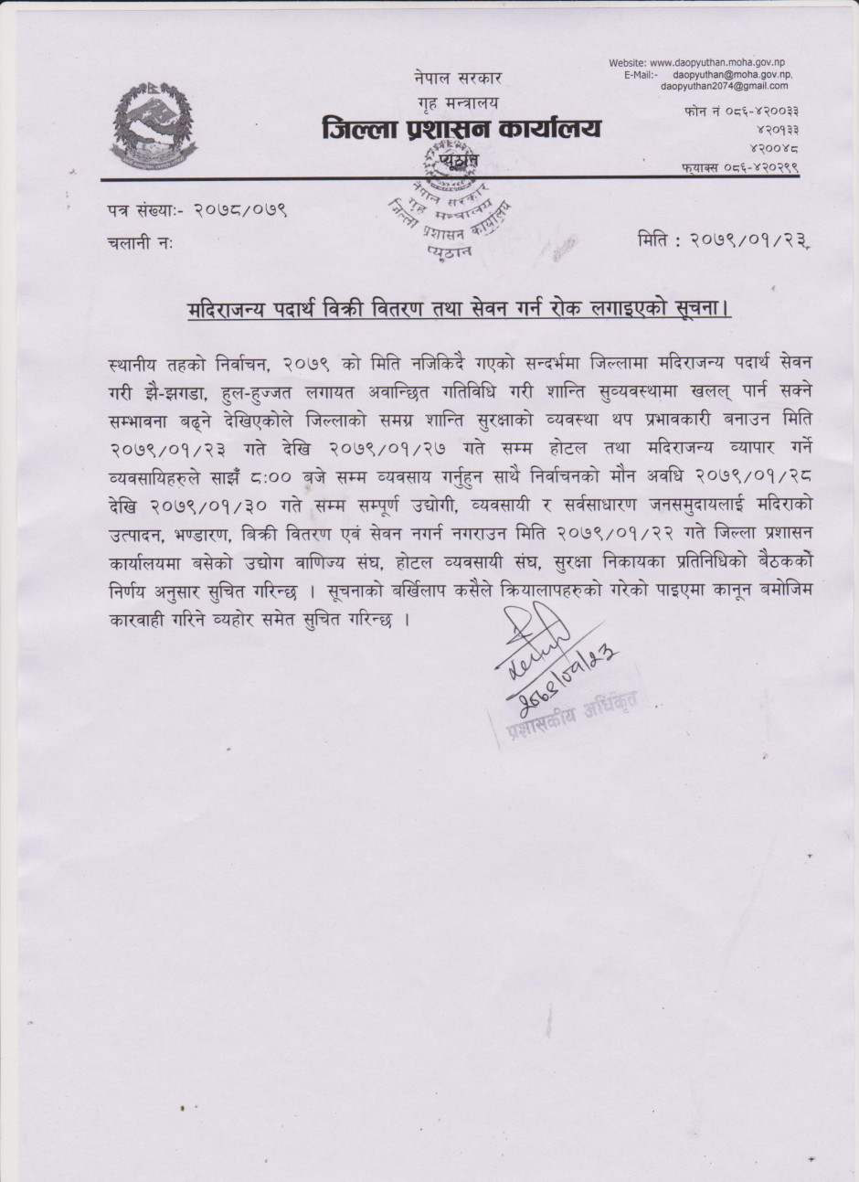 मदिराजन्य पदार्थ विक्री वितरण तथा सेवन गर्न रोक सम्बन्धी सूचना